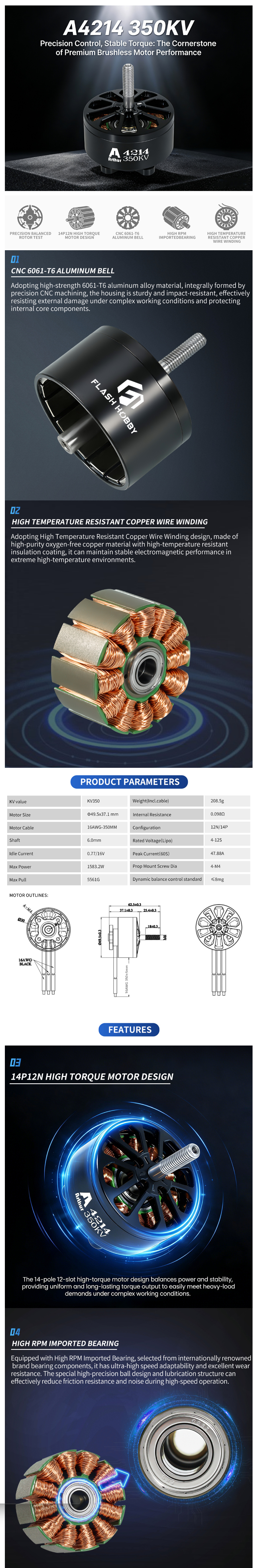 FLASHHOBBY A4214 350KV 4-12S Brushless Motor - 1PC