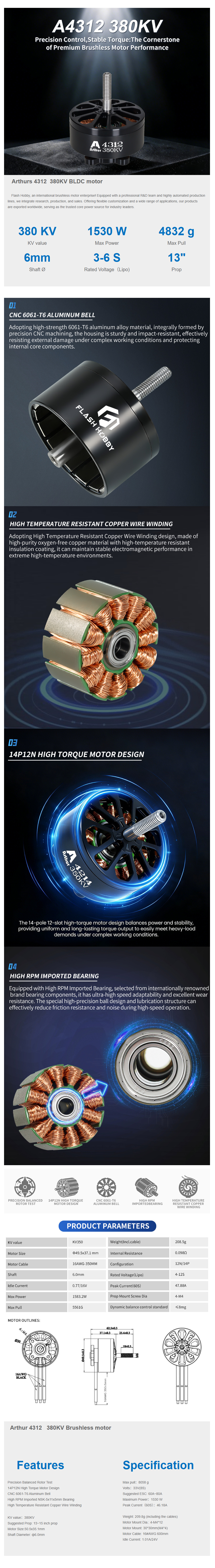 FlashHobby A4312 380KV 3-6S Brushless Motor - 1PC
