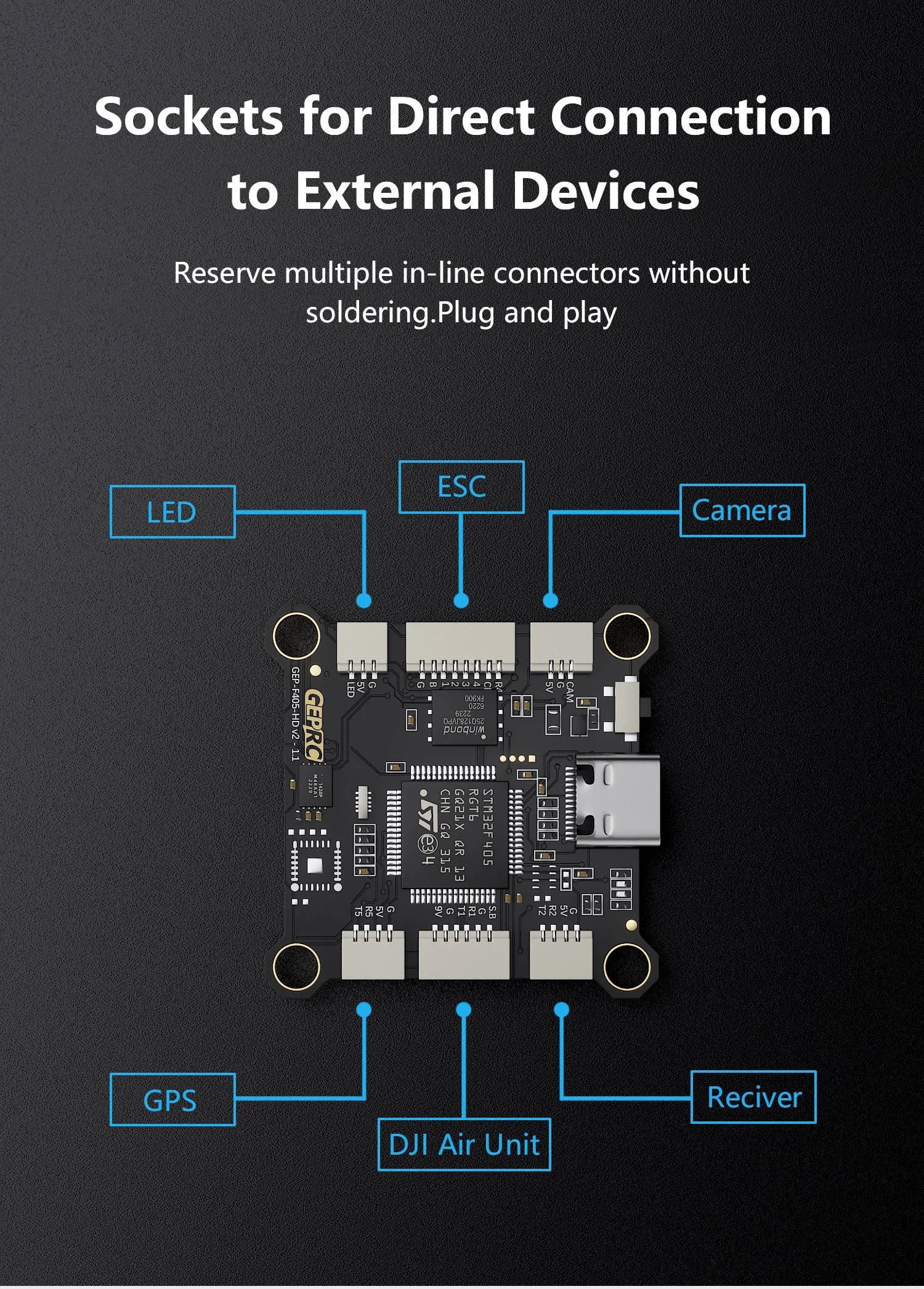 The GEPRC TAKER F405 BLS 50A STACK can be directly plugged into the DJI Air Unit, which can save the trouble of soldering. Upgrade the type-C USB connector, which greatly improves the service life of the socket and reduces the risk of poor contact. 9V 2.5A + 5V 3A dual independent BEC, more stable power supply for external devices.
