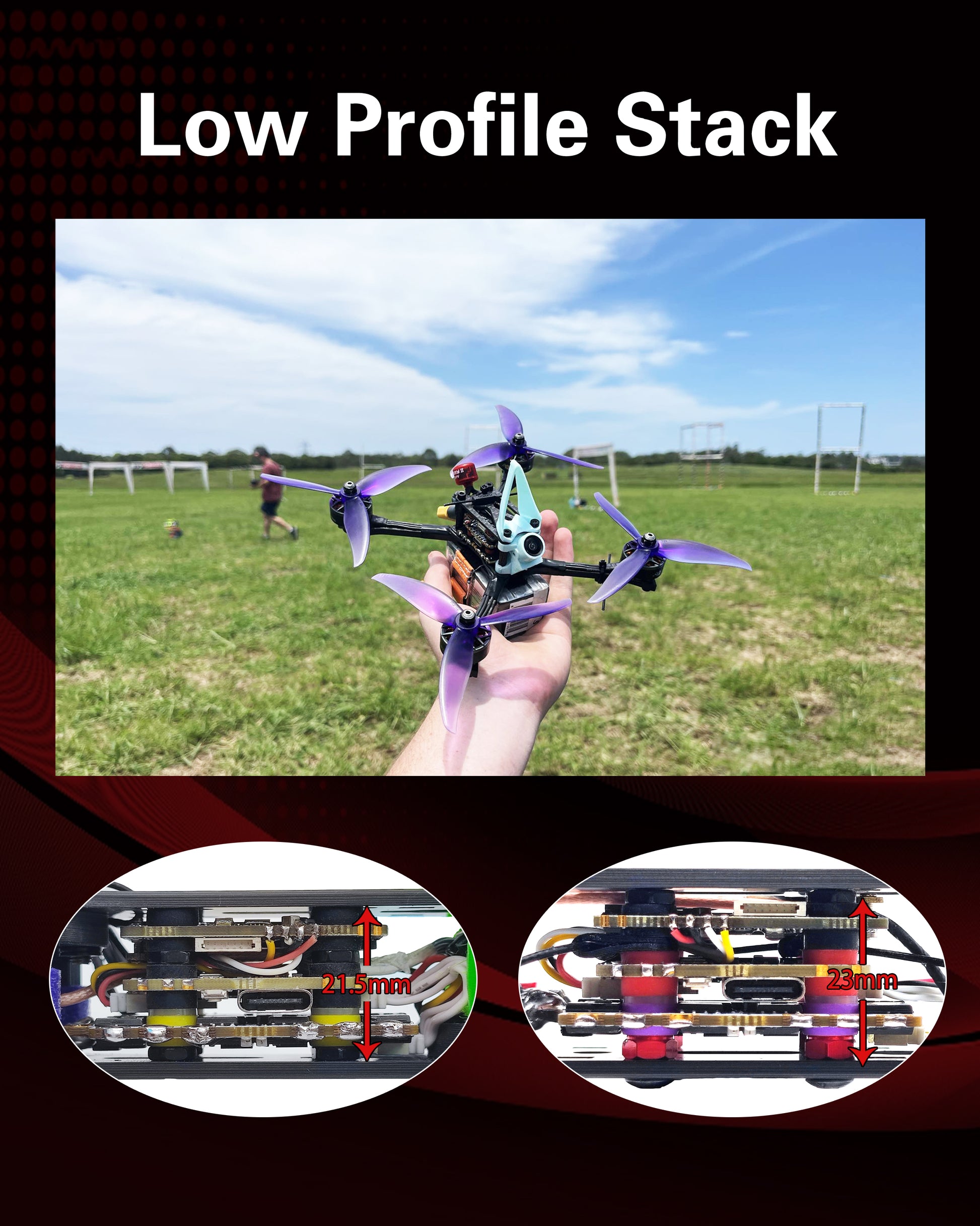 - Optimized for low-profile stacking with HDZero VTX