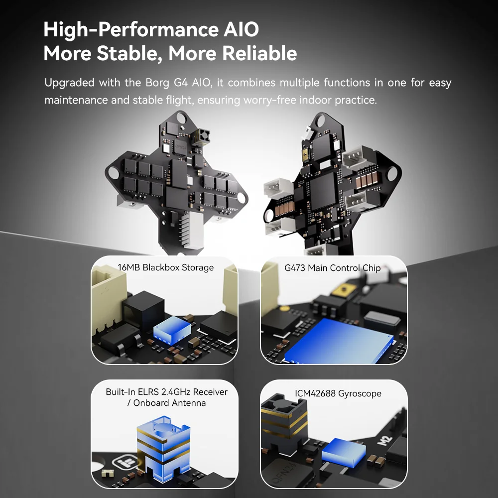 Integrated High-Performance Core: Adopts BorgG4 AIO engine, integrating G473 main controller, built-in receiver, and 16MB on-board flash, realizing streamlined and reliable performance.