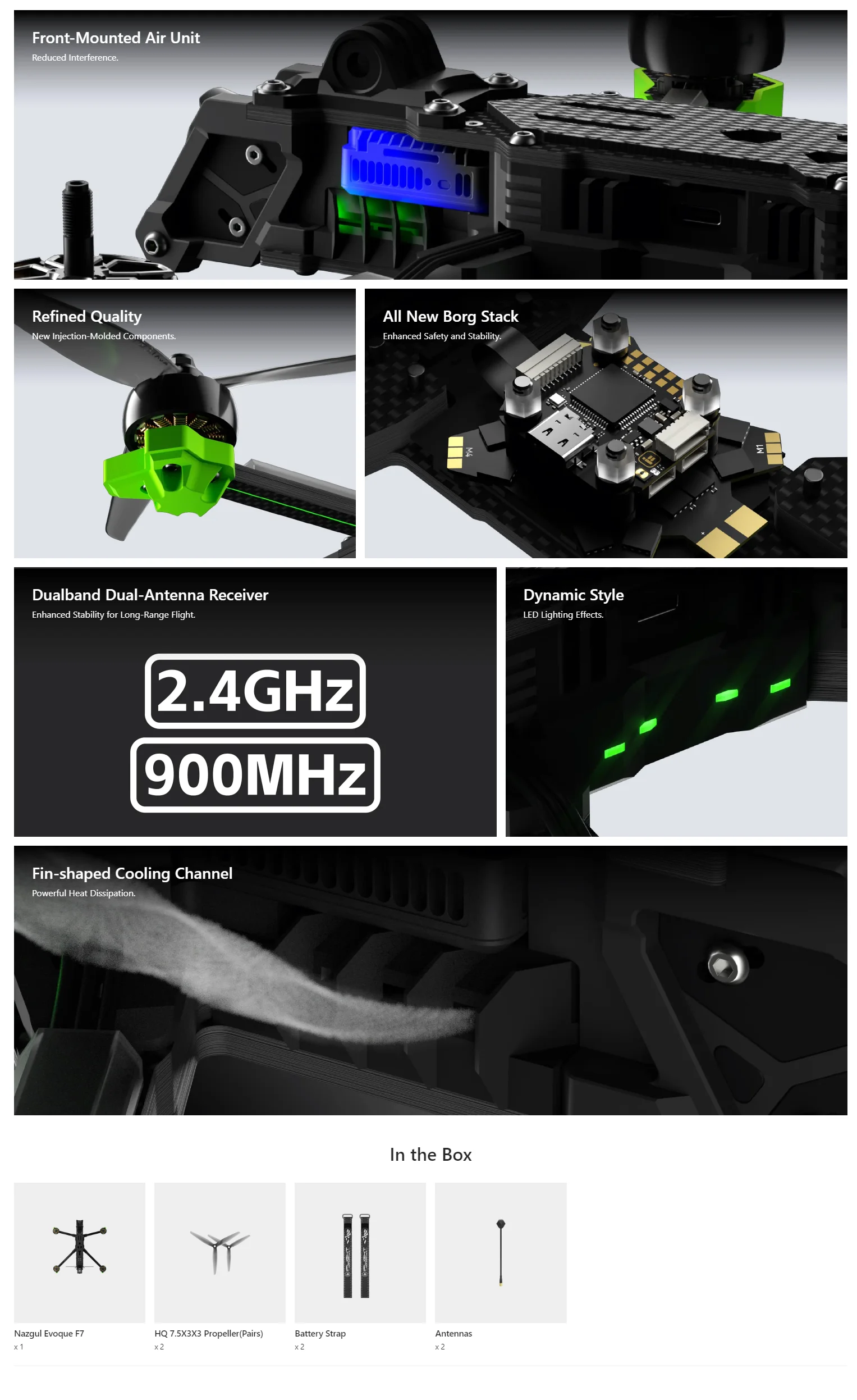 The fin-shaped cooling channel design enhances heat dissipation and ensures stable long-range flight performance. It comes with Dynamic LED effects full of recognition and technological sense.