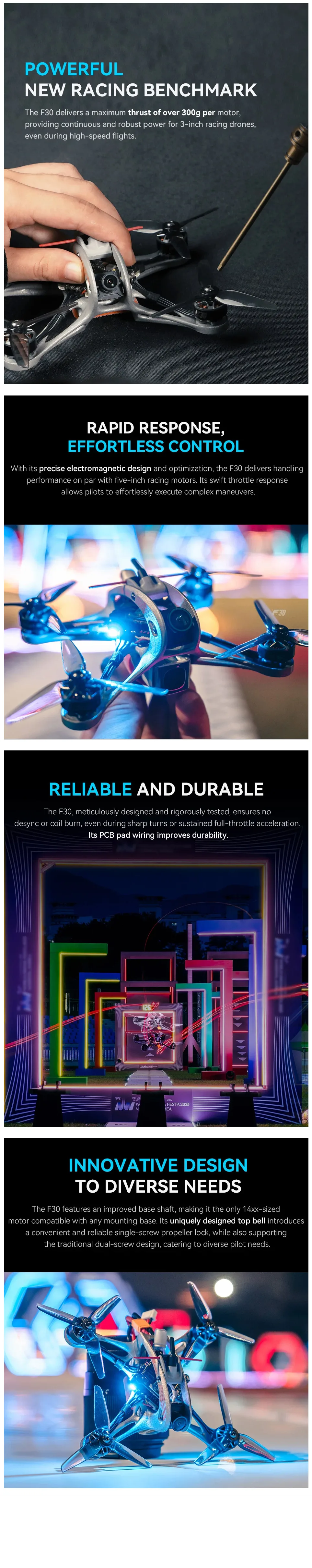 Designed for pilots who demand top-tier performance, the F30 combines precise electromagnetic optimization with innovative structural upgrades to provide handling on par with 5-inch racing motors.